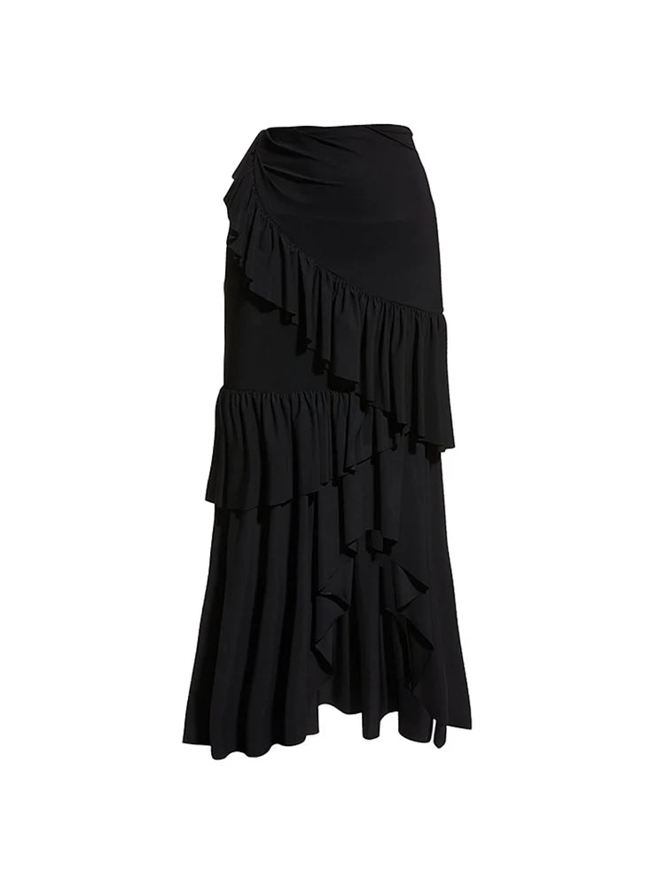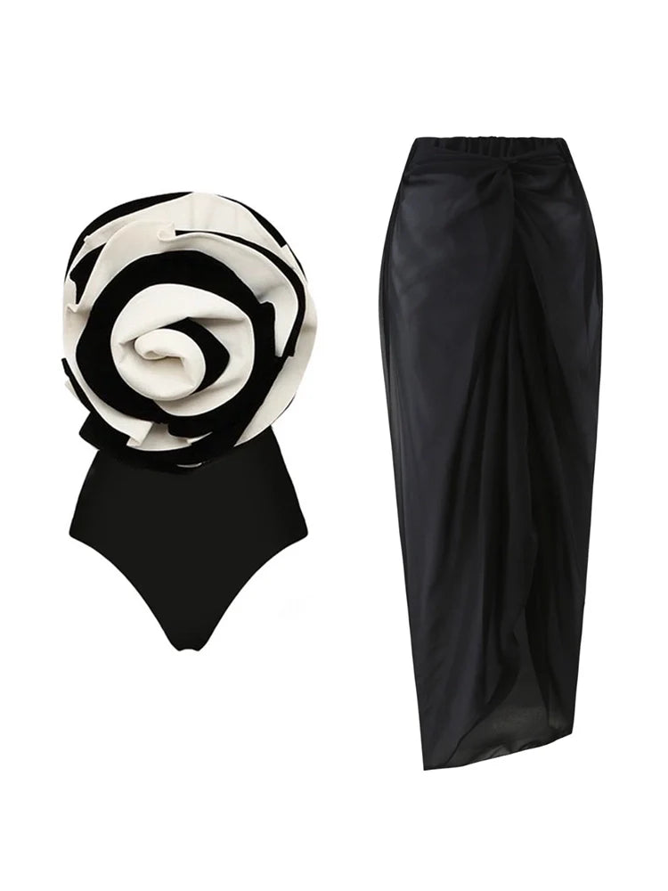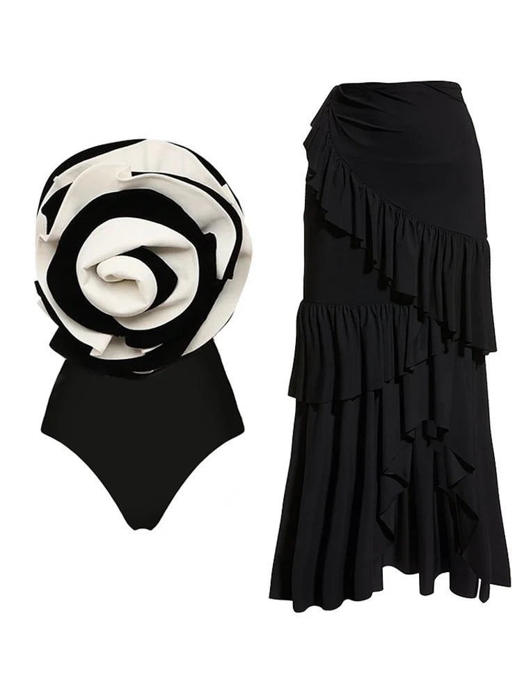 This high-impact swimwear set features two standout designs that combine sophistication with bold femininity. The first is a ruffle-skirted one-piece swimsuit showcasing dramatic black and white contrast with a large floral applique that adds sculptural flair. The elegant ruffle hem creates a soft, flowing effect reminiscent of a chic beach dress. The second design includes a sleek one-piece swimsuit paired with a side-slit wrap skirt in a matching color palette, offering a modern twist on vacation layering. Both styles are made from premium stretch fabric for a flattering fit, delivering style and comfort in equal measure.