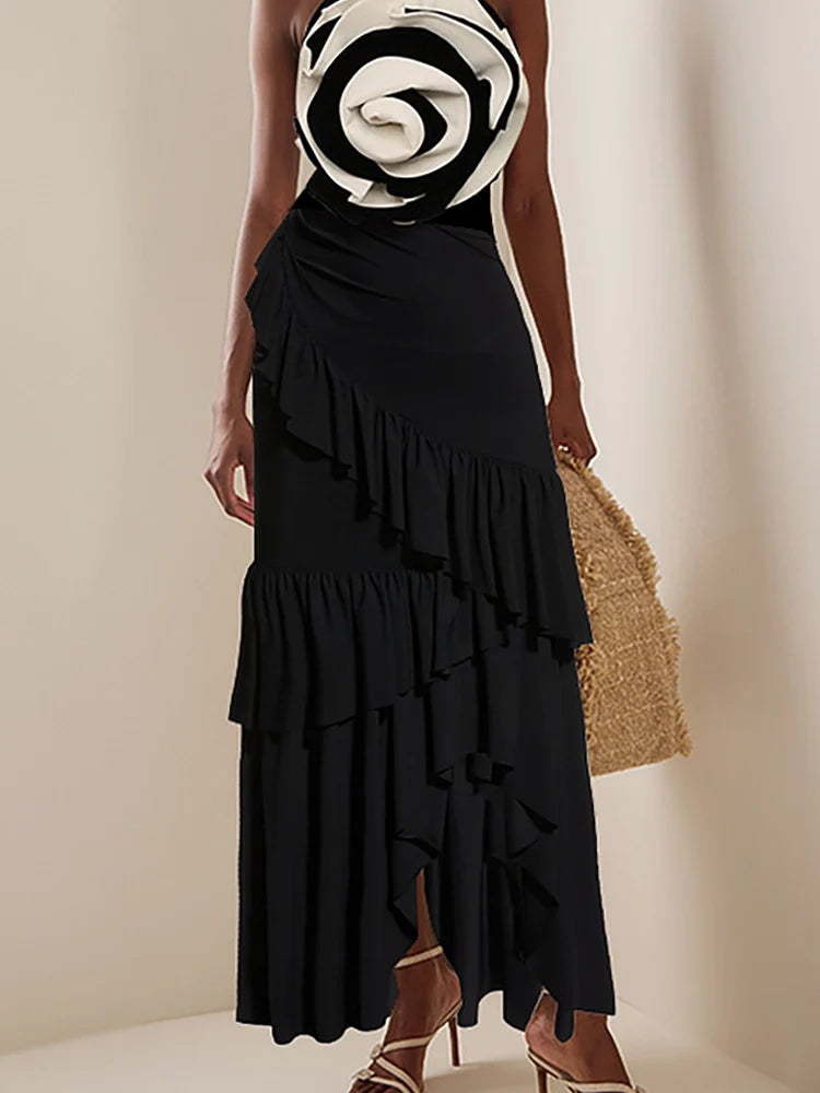 Striking black and white color contrast for elevated visual appeal oversized 3D flower decoration adds couture-inspired dimension ruffled hem and wrap skirt offer movement and coverage high-stretch material provides a sculpted, comfortable fit.