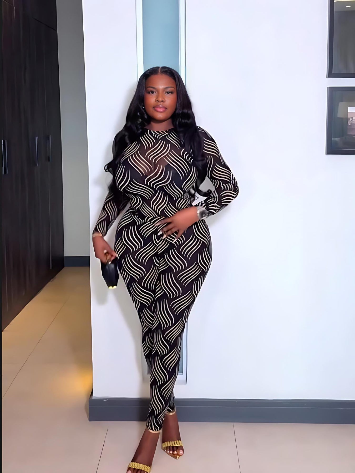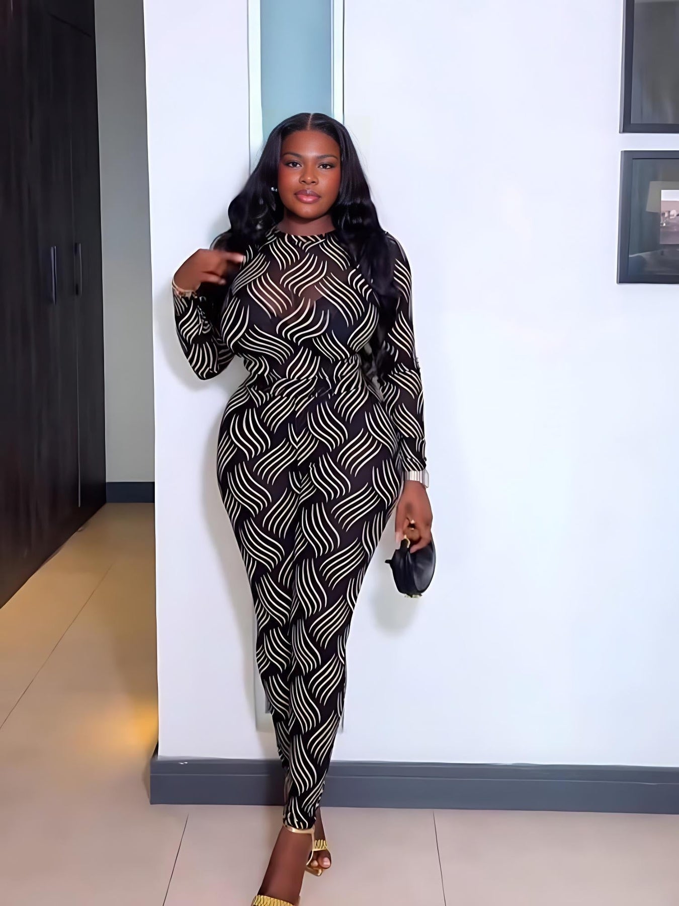 A striking fusion of modern geometry and tactile allure. This contemporary co-ord set features a sheer long-sleeve mesh bodysuit paired with matching slim-fit pants, both adorned with a mesmerizing black-and-white wave print. The play between transparency and bold pattern evokes refined sensuality, while the sculpted fit accentuates and elongates the form with effortless sophistication. Designed for the modern muse, it balances confidence and artistry — a statement of edge and elegance in perfect harmony.