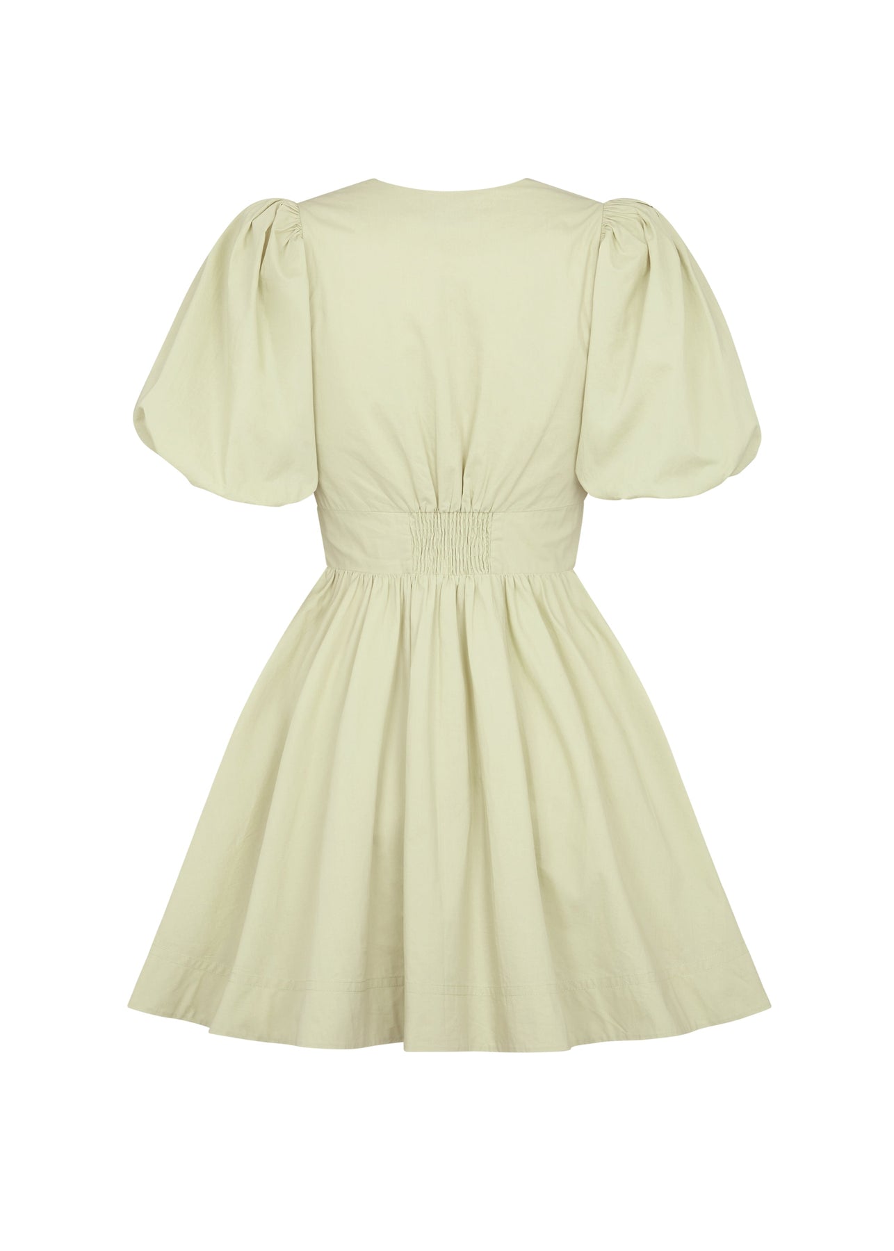 The Devon mini dress in pistachio is made from butter-soft cotton poplin, featuring double bow front details, blousy puff sleeves and a flattering deep V-front neckline.