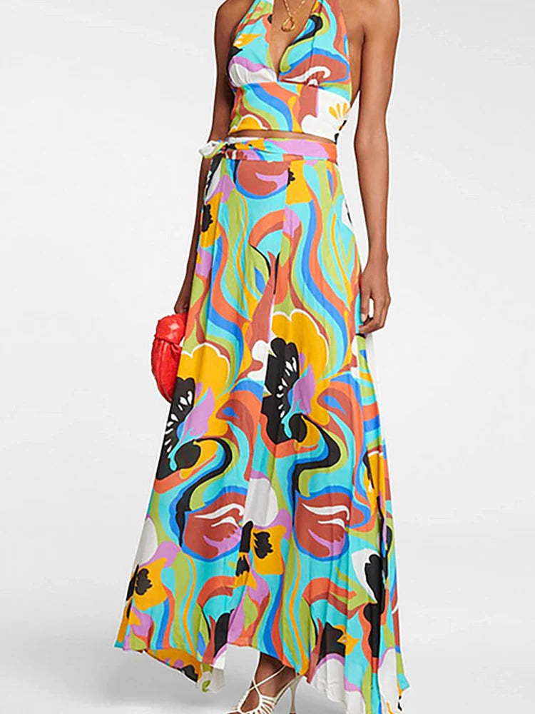 Deep V Halter Neck Print Sexy Swimsuit Set
