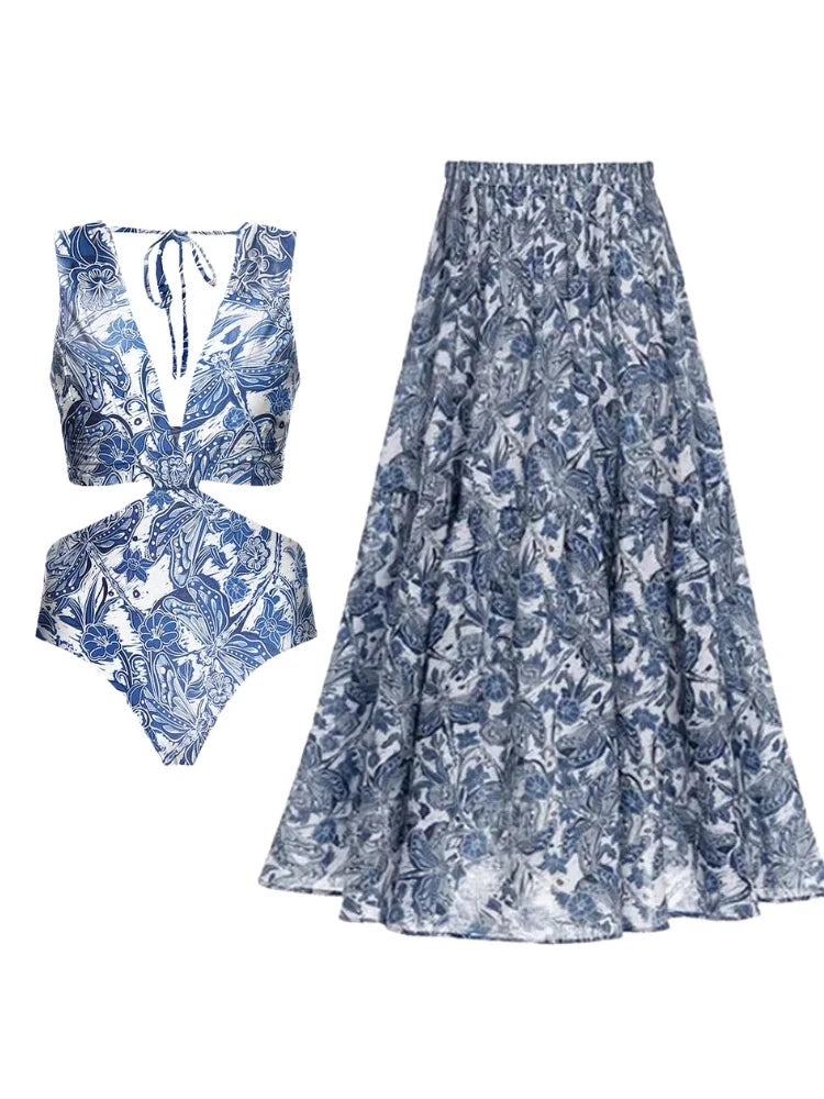This blue dragonfly V-neck cutout skirted swimsuit set combines elegance with playful charm, making it a standout piece for beach and resort wear. The unique dragonfly print adds a whimsical touch, while the V-neckline and side cutouts create a flattering, feminine silhouette. The attached skirt enhances the design with graceful movement and extra coverage, offering a balance of style and comfort. Crafted from soft, stretchable fabric, this swimsuit fits beautifully and allows for ease of movement during beachside activities.