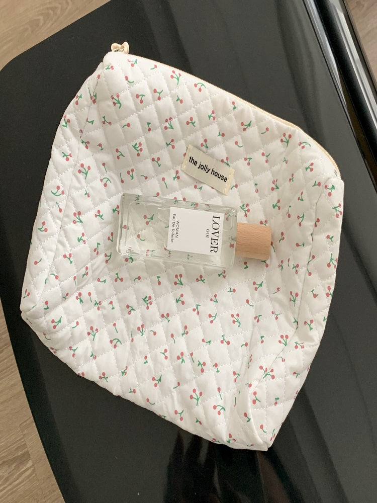 "Adorned with delicate floral prints, this makeup bag exudes a whimsical and feminine vibe."