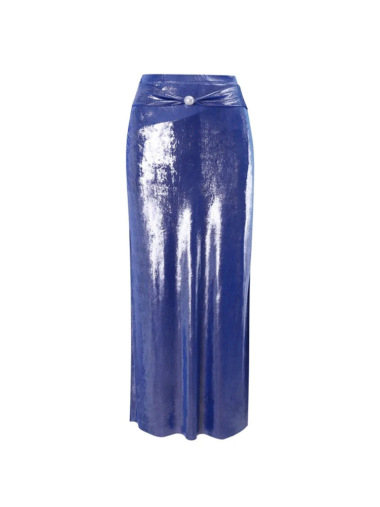 Radiating elegance and allure, this misty blue one-piece swimsuit features a glossy finish, a daring deep V-neckline, and exquisite pearl detailing. Designed for modern muses, it perfectly balances luxury and sensuality.
