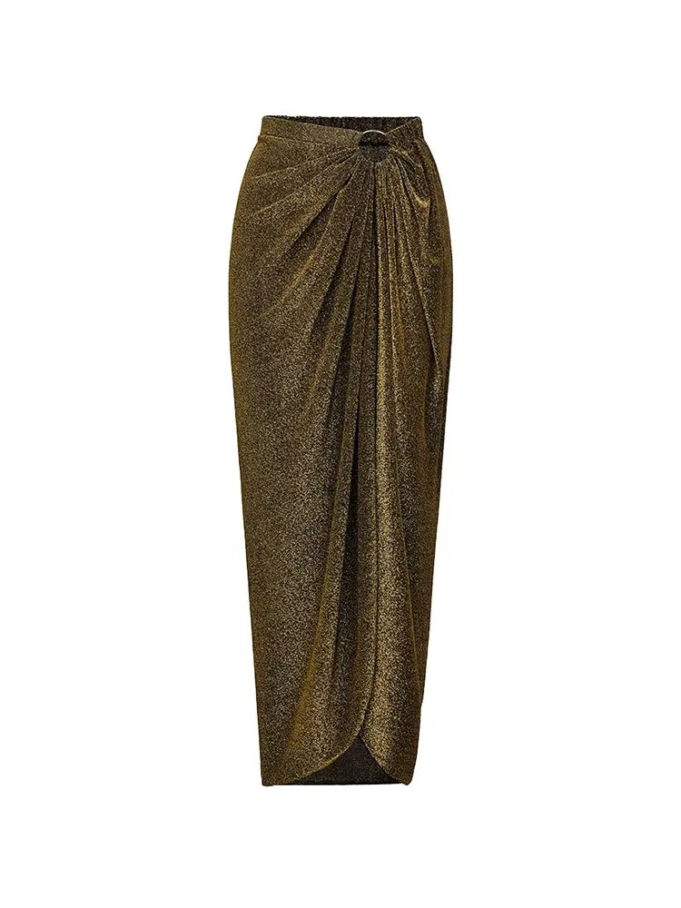 This glossy one-piece swimsuit set stands out with its lustrous finish and bold gold-tone circular buckle embellishments. Designed to catch the light, the swimsuit features strategic cutouts that accentuate the waist and neckline while maintaining a sleek and sculpted silhouette. The metallic accents add a luxurious edge, elevating the overall look. Made with high-stretch material, it offers both comfort and structure. The coordinated cover-up or skirt completes the set with a touch of glamour.