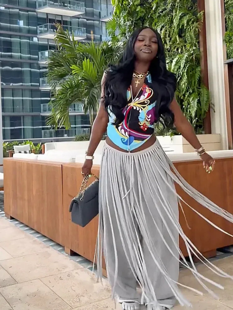 Versatile and edgy, the grey loose fringe Pants adds a dynamic and modern practical element to your wardrobe. Designed with a loose silhouette, this pants features removable fringe panels that can be adjusted to suit your personal style. The elastic waistband ensures all-day comfort, while the slanted side pockets and leather patch on the back add practical details without losing refinement.