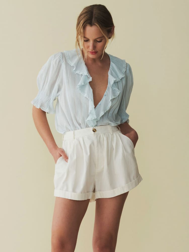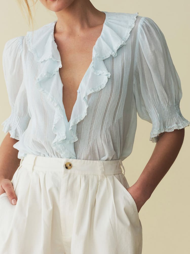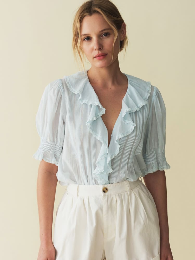 Crafted from the softest organic cotton voile, the Edwardian-inspired Henri Top—which made its debut in Spring 2018—is a Favorite Character we find ourselves returning to again and again. It features a plunging V-neckline framed with cascading lace-trimmed ruffles that extend down the bodice and delicate clustered pintucks at the yoke, back, and short puffed sleeves. A line of hidden starburst buttons run up the center front. Wear it loose, or tuck it into your favorite high-waisted jeans.