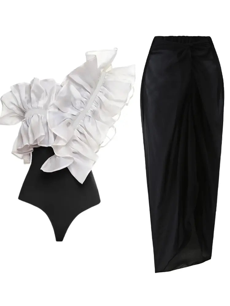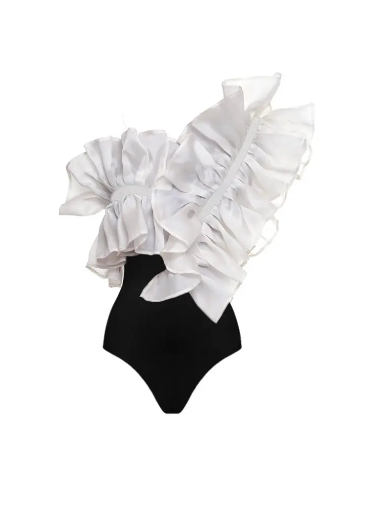 Inspired by timeless Hepburn elegance, this black and white one-piece swimsuit blends vintage charm with modern sophistication. The refined color-block design is elevated by delicate lace mesh detailing, adding texture and allure while maintaining a graceful silhouette. Its sculpting cut flatters the waistline and provides ample support, making it a standout choice for chic vacation moments at the hot springs or beach.