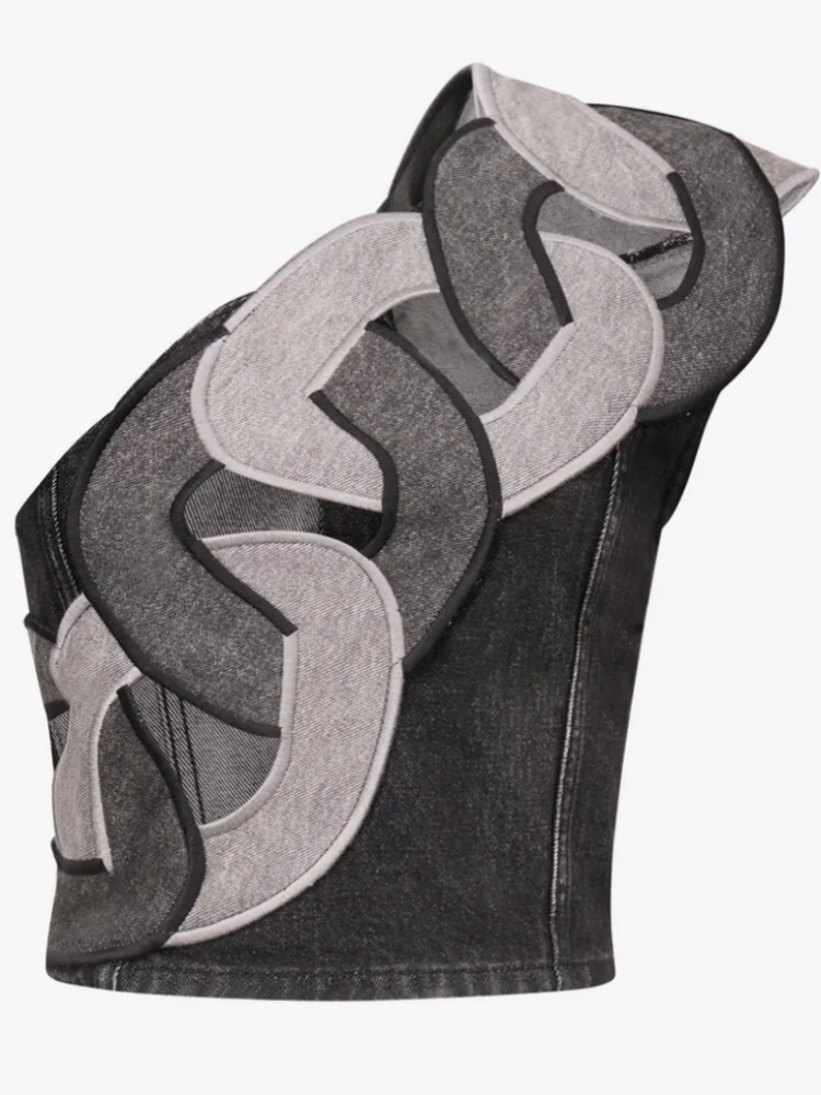 Fierce and fashion-forward, the Lock Ring Type Irregular Jeans Set delivers bold structure with edgy details. This striking two-piece features a strapless top with an asymmetrical neckline, front cut-out, and standout lock ring embellishment. Paired with tailored pants in a sleek black-gray palette, complete with matching ring detail, front zipper, and pockets—this set commands attention from every angle.
