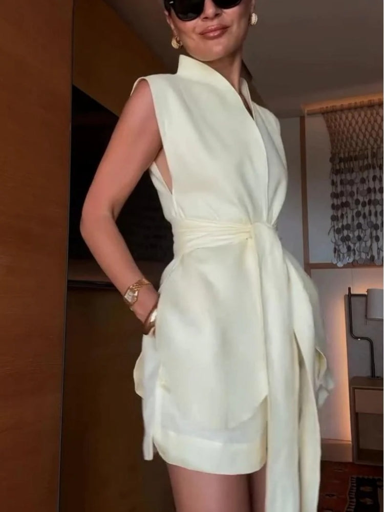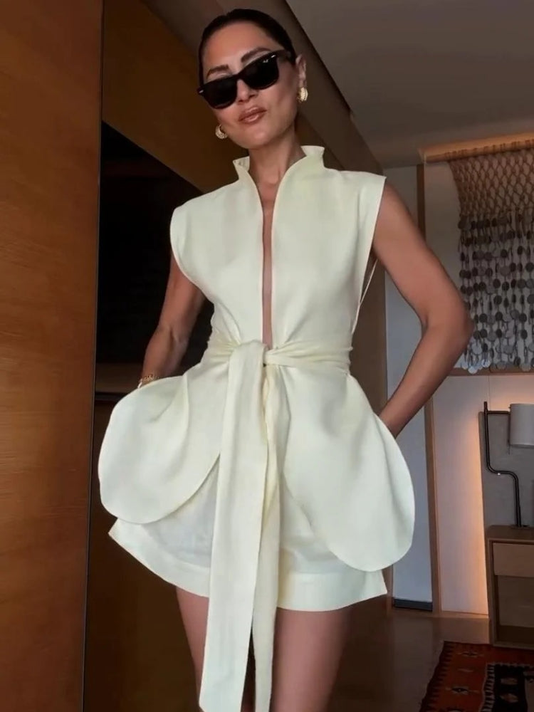 Effortlessly chic and designed for ultimate comfort, the Nola Vest Shorts Set combines breezy elegance with a flattering fit. The sleeveless vest top features a unique petal-shaped hem that adds movement and charm, cinched at the waist with a matching belt for an enhanced silhouette. Paired with tailored shorts, the elastic waistband ensures a relaxed yet flattering fit, while the back and side pockets add both practicality and style.