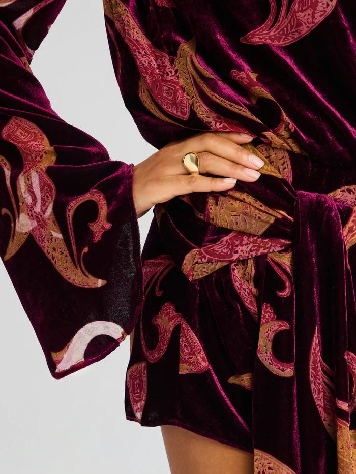 Crafted in a short mini silhouette, it highlights the legs and elongates the figure. The plush velvet fabric, paired with intricate paisley prints, creates a rich visual texture that captures both luxury and artistic flair.