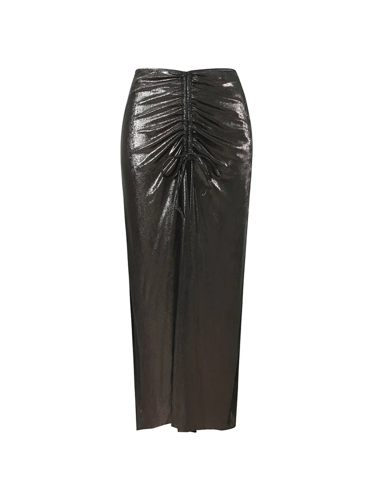 This pearl cutout glossy colorblock swimsuit with matching black wrap skirt is a striking fusion of elegance and edge. The one-piece swimsuit features a lustrous finish with bold colorblocking that enhances the figure, while pearl embellishments along the cutouts add a luxurious touch. The artfully placed cutouts flatter the waist and neckline, delivering a high-fashion silhouette. Paired with a sleek black wrap skirt, the set transitions effortlessly from beachwear to a chic resort look.