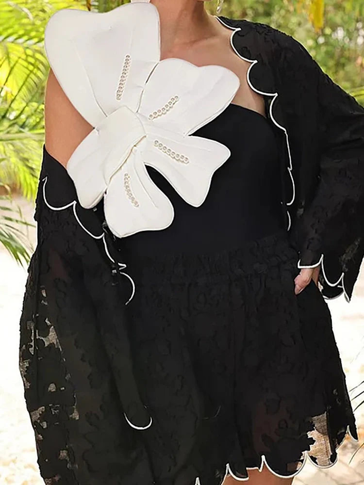 This black swimsuit set blends elegance and femininity with exquisite pearl flower embellishments. Designed for those who love a touch of glam, it brings sophistication to any beachside or resort look.