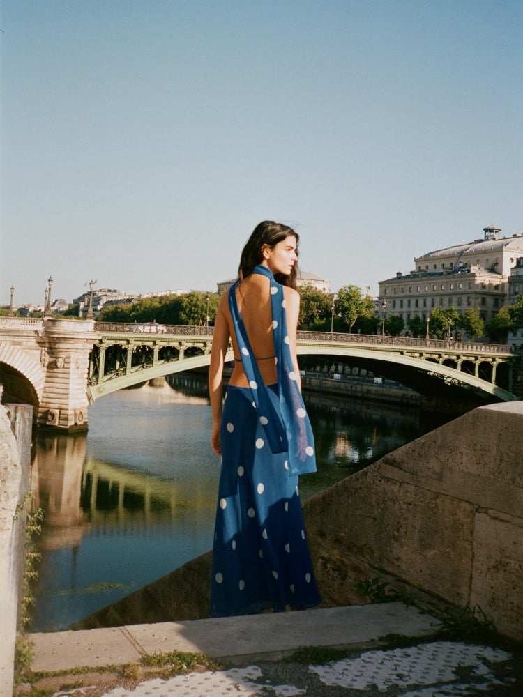 Romantic and refined with a vintage twist, this polka dot midi dress features a fluid draped halter neckline that flatters the shoulders and adds elegant movement. A matching fabric scarf offers styling versatility — wear it loose, knotted, or as a chic accent.