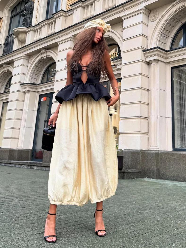 Step into timeless elegance with this French retro–style two–piece set. The cropped, waist–cinching black top highlights your figure with refined tailoring, while the beige balloon wide–leg pants balance the look with softness and fluidity. Together, they create a stylish contrast that exudes sophistication and modern charm.