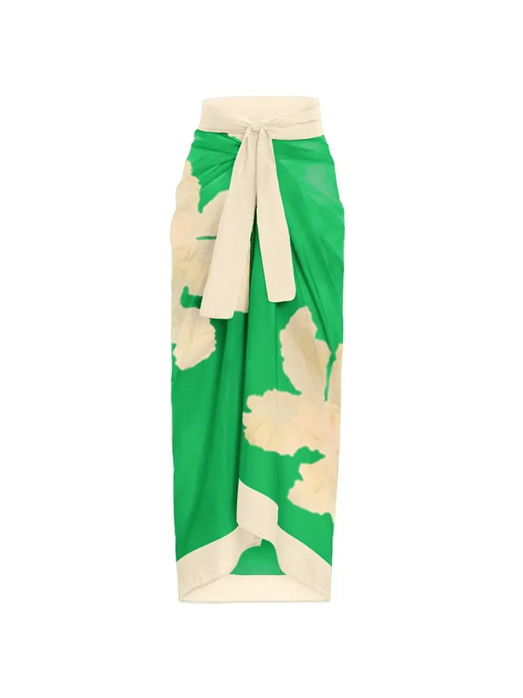 This eye-catching two-piece swimsuit brings elevated craftsmanship to beachwear with intricate stitch detailing and sculpted ruffle edges. The floral print adds a romantic, vibrant flair while the structured lines enhance the figure. Paired with a bold, large-print wrap skirt, this set perfectly balances elegance and playful vacation energy for a standout look under the sun.