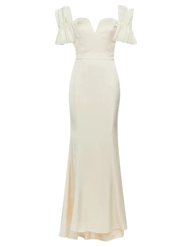 This elegant dress features a strapless design with exquisite mesh inserts and a flattering high-end silhouette. The fitted bodice and short sleeves add a touch of modern sophistication, while the open back reveals just the right amount of allure. Perfectly crafted for formal occasions, this dress promises to turn heads with its sleek, graceful lines and luxurious feel.