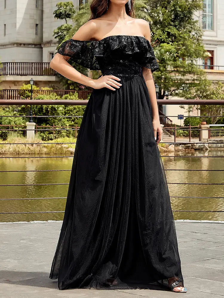 This stunning summer dress combines playful elegance with a touch of sparkle. The strapless design with short sleeves enhances your shoulders and arms, while the body-hugging fit flatters your figure. Crafted from sequin-studded mesh fabric, this dress radiates glamour and sophistication, making it perfect for any chic evening or summer event. The combination of sequins and mesh adds an eye-catching, playful vibe.