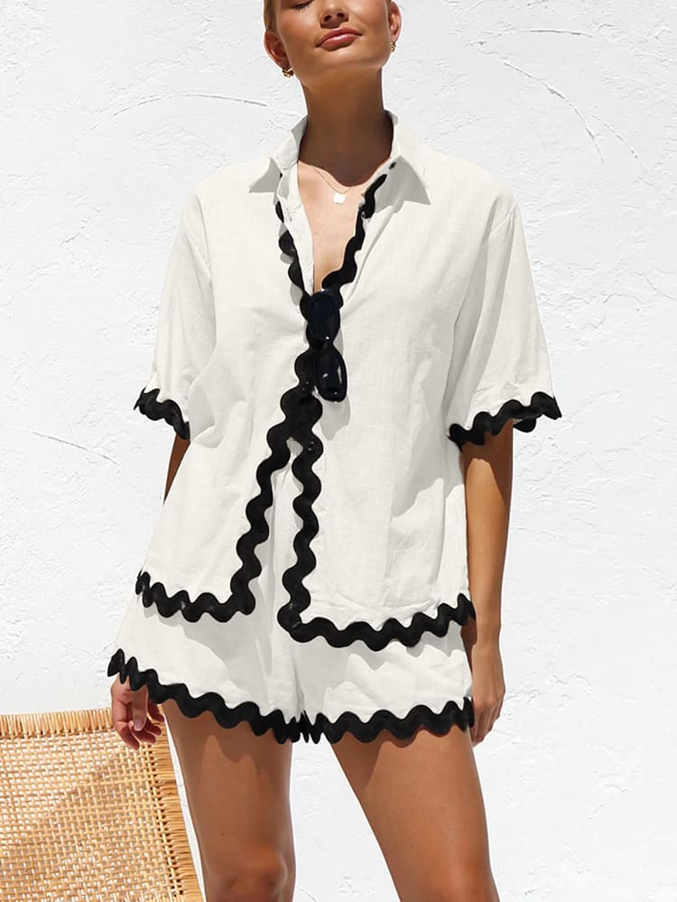 Our?solid monotone set featuring a solid shirt blouse and high waist wide leg shorts with constrasting patchwork is for sure a show stopper. Summersets are all year round clock best sellers. From a day occasion, tonight's get-together, the printed pattern collar and sleeves, just add a touch to the overall look's aesthetics.