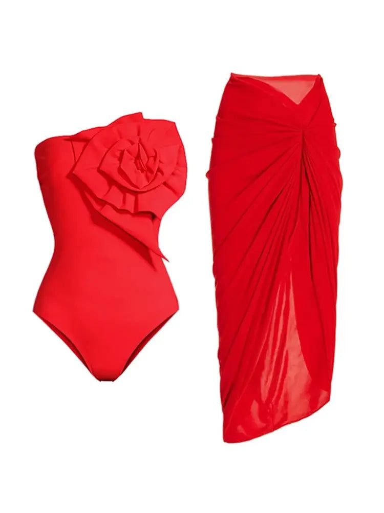 This chic red one-piece swimsuit features a timeless strapless design adorned with a bold 3D floral accent at the bust, adding a romantic and feminine flair. The pure color palette enhances its elegance, while the sculpted fit flatters your natural curves. Made from premium stretch fabric, it ensures comfort and a secure fit for all-day beach or poolside lounging. A standout piece in any swimwear collection, blending simplicity with striking detail.