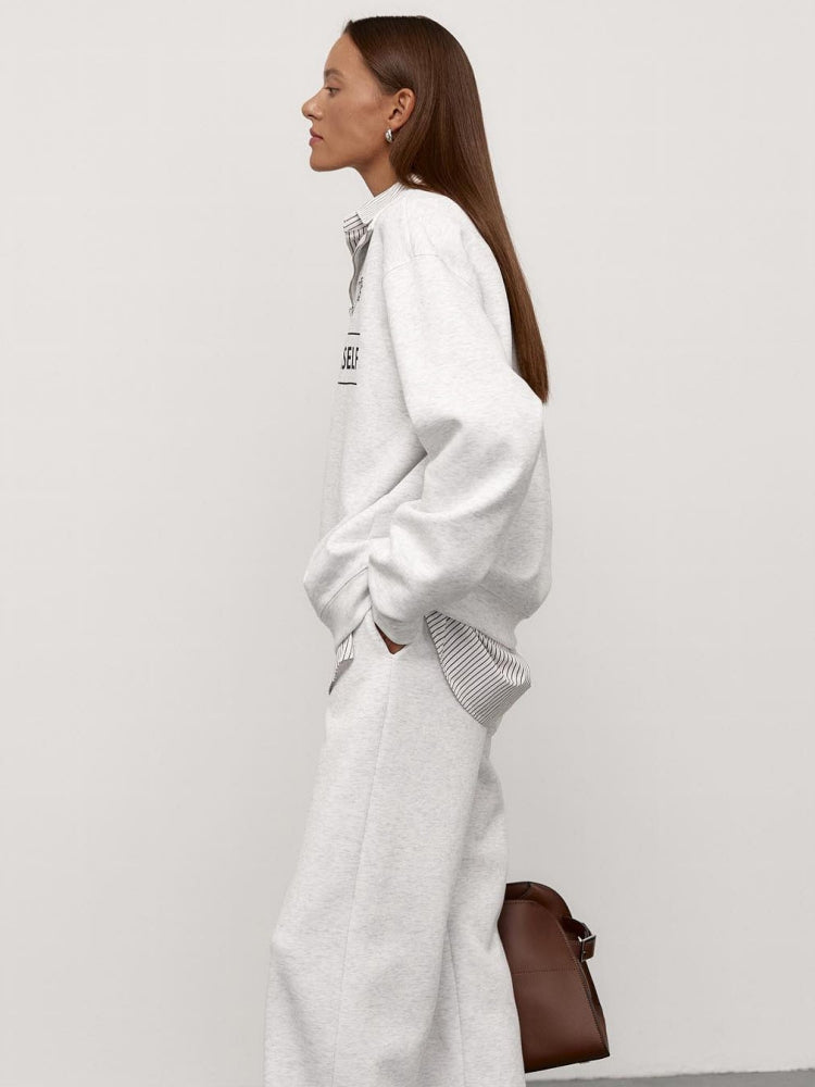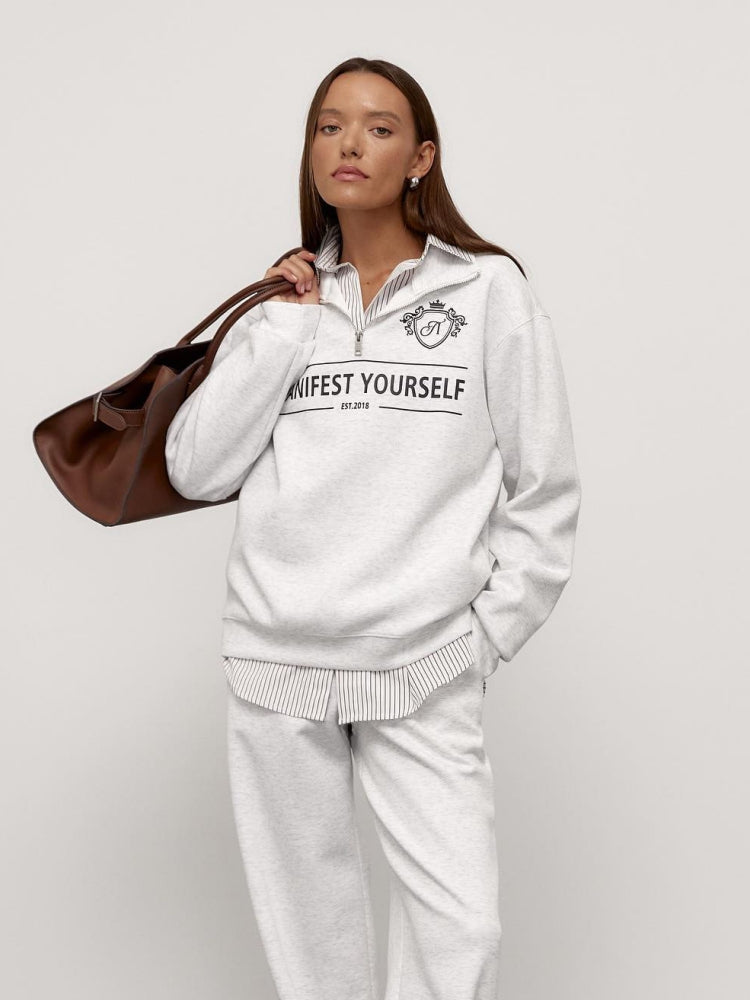 This letter print semi-zip sweatshirt redefines streetwear with its innovative design, blending an oversized silhouette with functional style. The stand-collar neckline features a hidden zip closure that allows adjustable ventilation and styling options. Bold typographic prints create visual impact across the relaxed fit body, while ribbed cuffs and hem ensure a clean finish. Crafted from heavyweight French terry fabric, it offers substantial warmth without bulk, making it the ultimate transitional piece for urban explorers.
