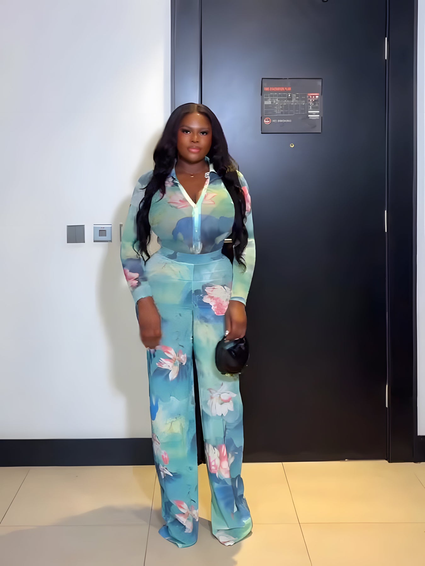 A serene blend of Eastern elegance and contemporary allure. This turquoise co-ord set features a fitted sleeveless bodysuit paired with flowing wide-leg pants, both adorned with exquisite lotus and leaf prints that evoke the calm beauty of a tranquil pond. The fluid silhouette moves gracefully with every step, while the delicate sheen of the fabric enhances its refined charm. Designed to balance softness and sophistication, this ensemble embodies effortless grace with a modern twist.