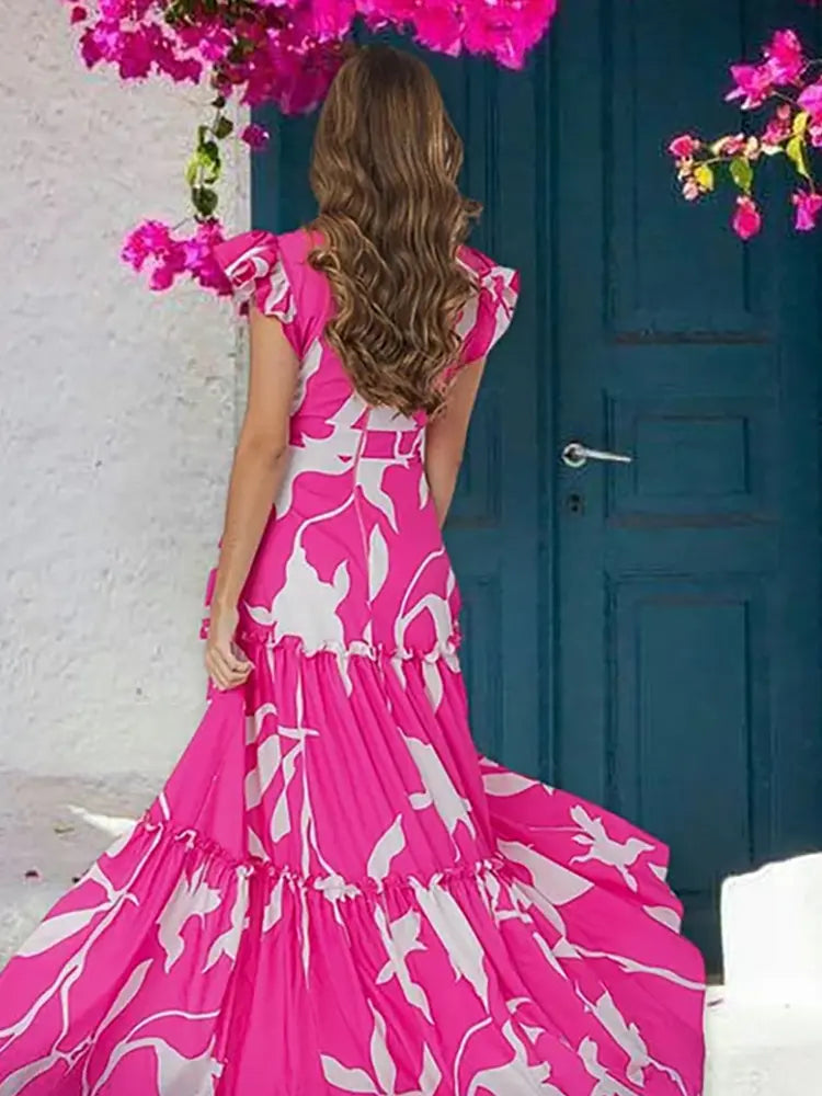 V-neck design with delicate ruffle trim, bold vacation-style print, high-stretch fabric for support and shape, matching flowy skirt for added elegance.